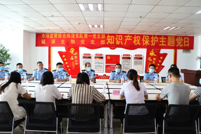 服務(wù)經(jīng)濟發(fā)展,賦能強市建設(shè)。2022年9月2日,山東健源生物黨支部與泰安市市場監(jiān)管綜合執(zhí)法支隊黨支部聯(lián)合開展"知識產(chǎn)權(quán)保護主題黨日"活動,增強企業(yè)知識產(chǎn)權(quán)保護意識。泰安市市場監(jiān)管綜合執(zhí)法支隊副支隊長孫鳳明、任常平帶領(lǐng)第一支部12名黨員參加,山東健源生物行政副總經(jīng)理王玲、技術(shù)研發(fā)部主任董桂紅等相關(guān)部門負責(zé)人一同參與活動。