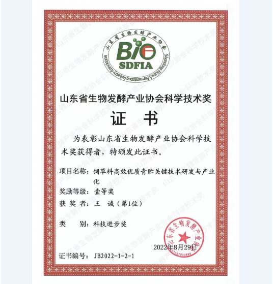 根據(jù)《國(guó)務(wù)院辦公廳關(guān)于完善科技成果評(píng)價(jià)機(jī)制的指導(dǎo)意見》(國(guó)辦發(fā)(2021)26 號(hào))和《山東省科技廳關(guān)于進(jìn)一步鼓勵(lì)和規(guī)范山東省社會(huì)力量獎(jiǎng)設(shè)立科學(xué)技術(shù)獎(jiǎng)的指導(dǎo)意見》(魯科字[2018]129號(hào))精神,按照《山東省生物發(fā)酵產(chǎn)業(yè)協(xié)會(huì)科學(xué)技術(shù)獎(jiǎng)獎(jiǎng)勵(lì)章程》相關(guān)規(guī)定,開展了 2022 年度山東省生物發(fā)酵產(chǎn)業(yè)協(xié)會(huì)科學(xué)技術(shù)獎(jiǎng)的申報(bào)、評(píng)審工作,經(jīng)山東省生物發(fā)酵產(chǎn)業(yè)協(xié)會(huì)科學(xué)技術(shù)獎(jiǎng)勵(lì)委員會(huì)評(píng)審和審核,山東省生物發(fā)酵產(chǎn)業(yè)協(xié)會(huì)批準(zhǔn),授予2項(xiàng)成果為科技進(jìn)步獎(jiǎng)一等獎(jiǎng),4項(xiàng)成果為科技進(jìn)步獎(jiǎng)二等獎(jiǎng),5項(xiàng)成果為科技進(jìn)步獎(jiǎng)三等獎(jiǎng)。山東健源生物科技有限公司《飼草料高效優(yōu)質(zhì)青貯關(guān)鍵技術(shù)研發(fā)與產(chǎn)業(yè)化》項(xiàng)目榮獲山東省生物發(fā)酵產(chǎn)業(yè)協(xié)會(huì)科學(xué)技術(shù)獎(jiǎng)科技進(jìn)步獎(jiǎng)一等獎(jiǎng)。
